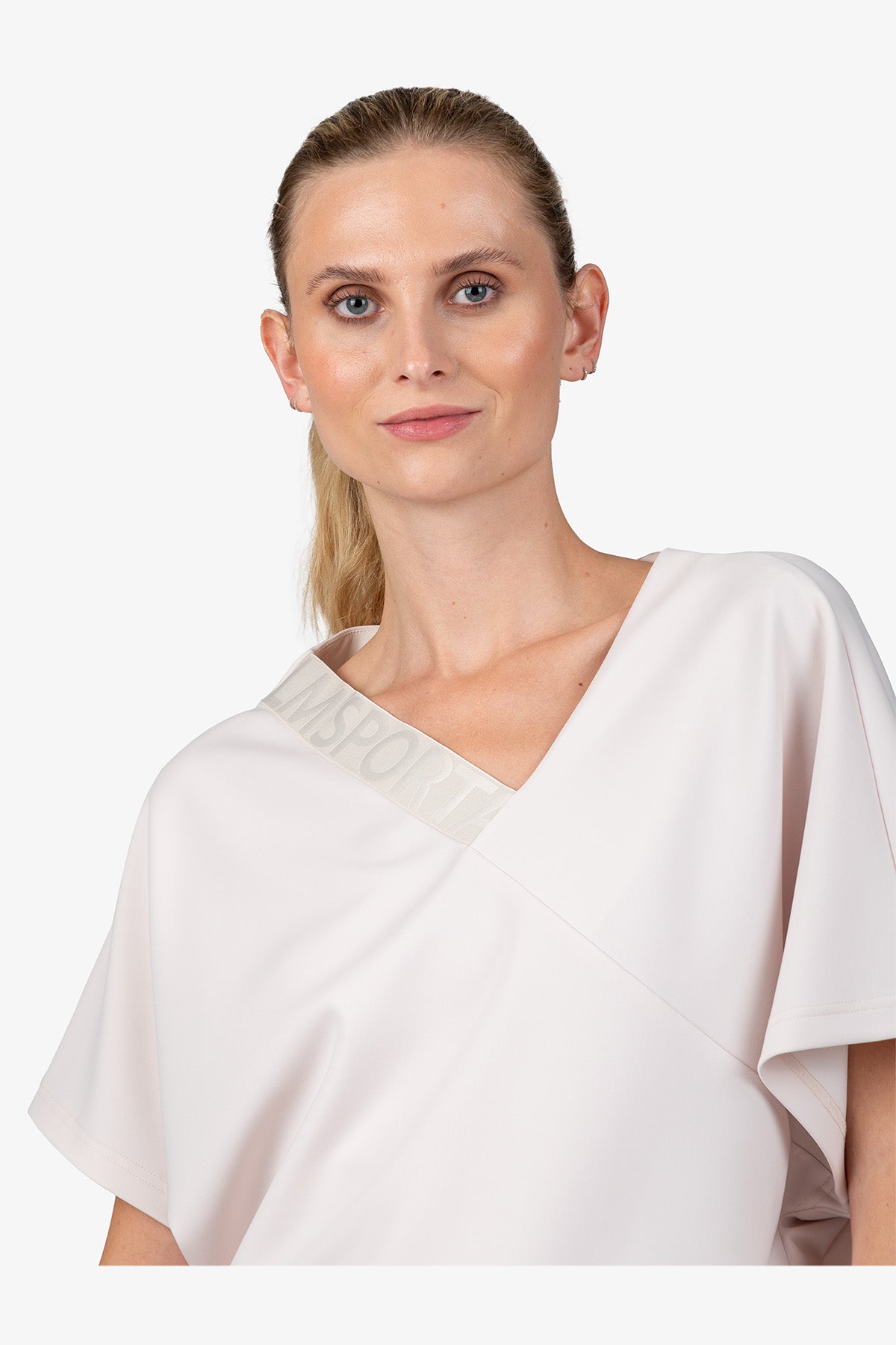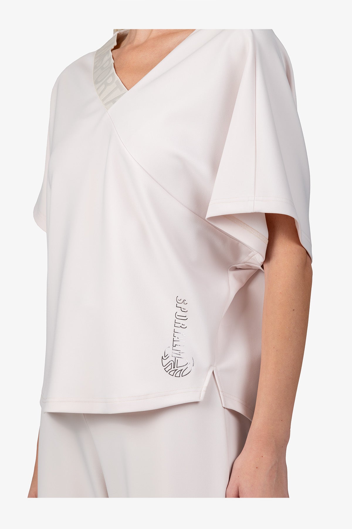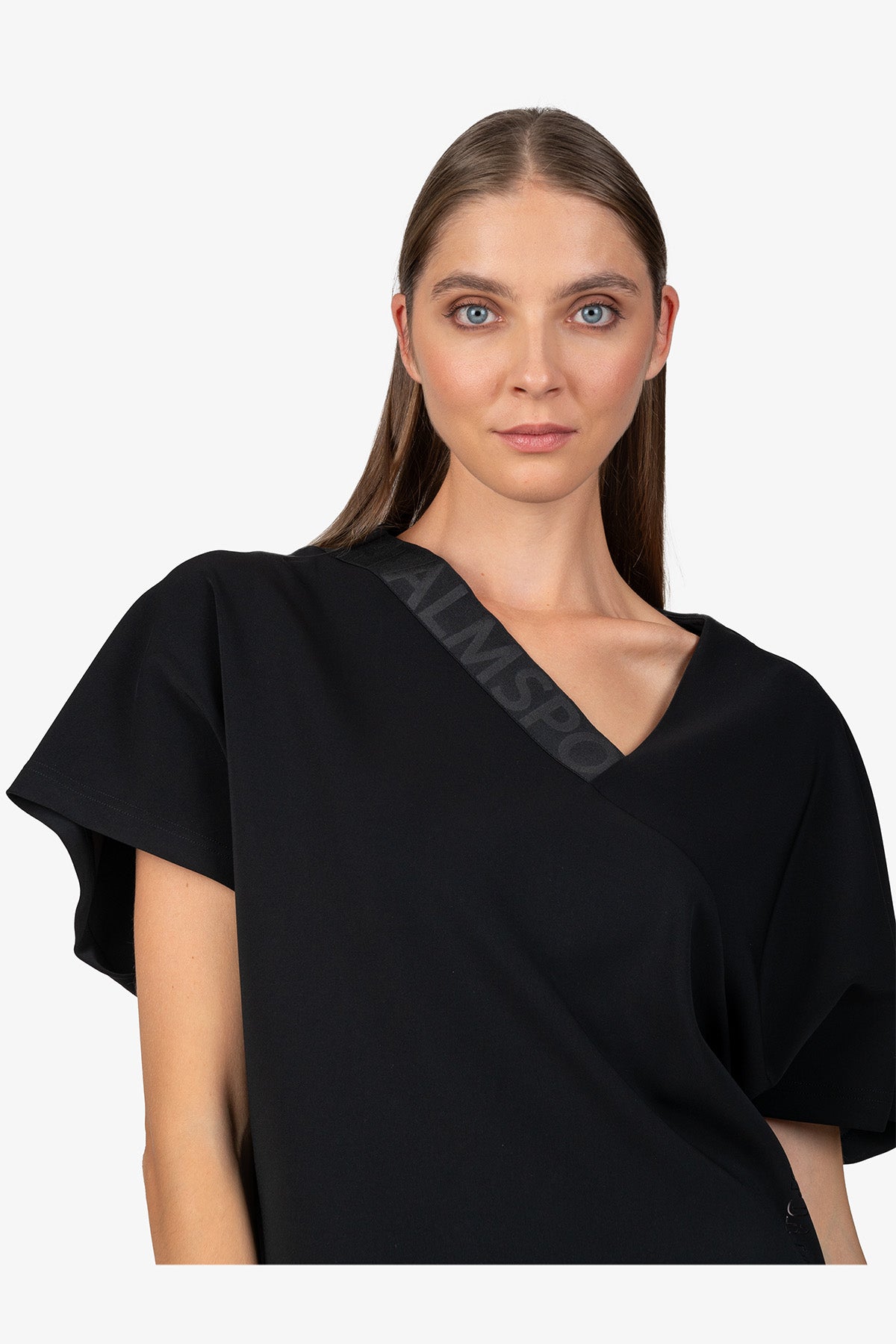 不對稱 V 領蝙蝠袖襯衫。這款獨特的設計凸顯每個身材並凸顯時尚氣息。一款多功能且時尚的服裝。