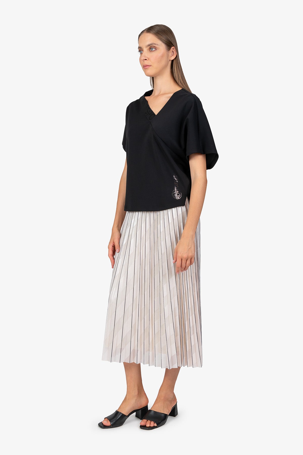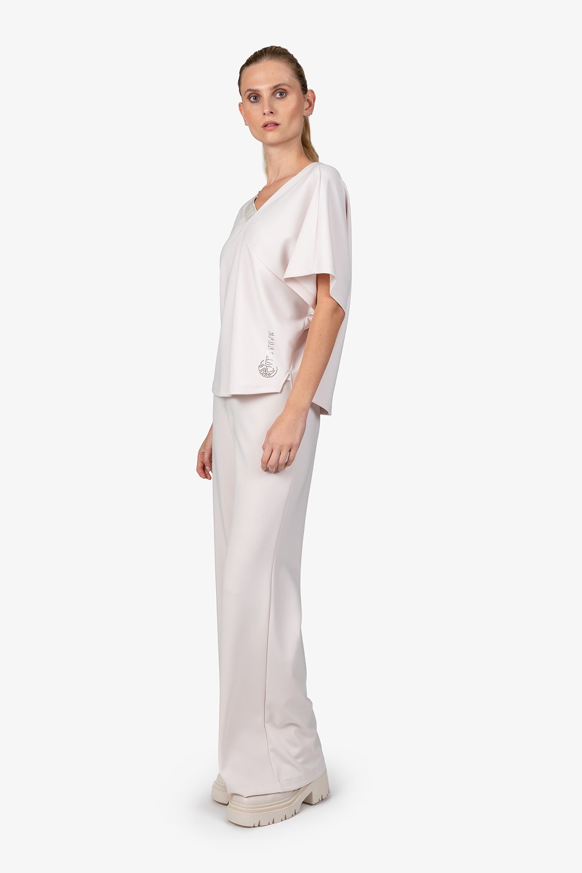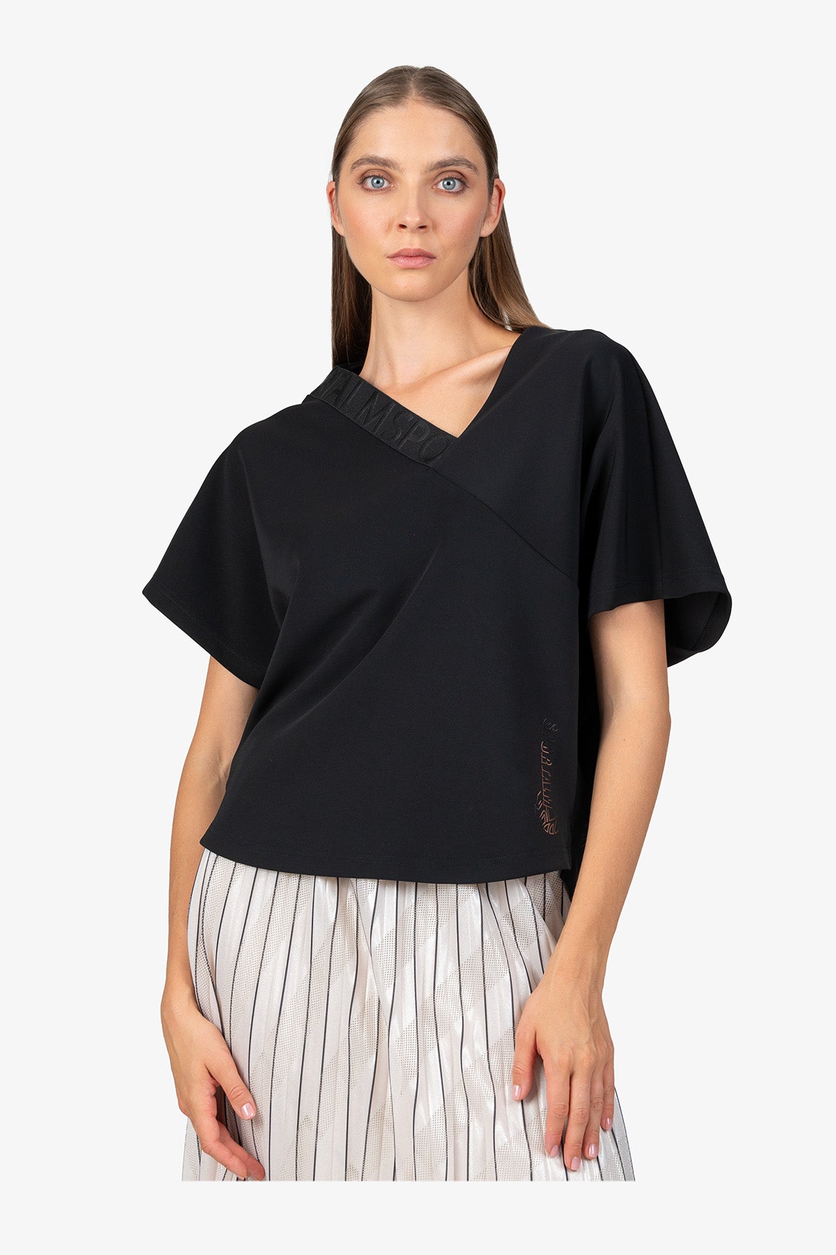 不對稱 V 領蝙蝠袖襯衫。這款獨特的設計凸顯每個身材並凸顯時尚氣息。一款多功能且時尚的服裝。