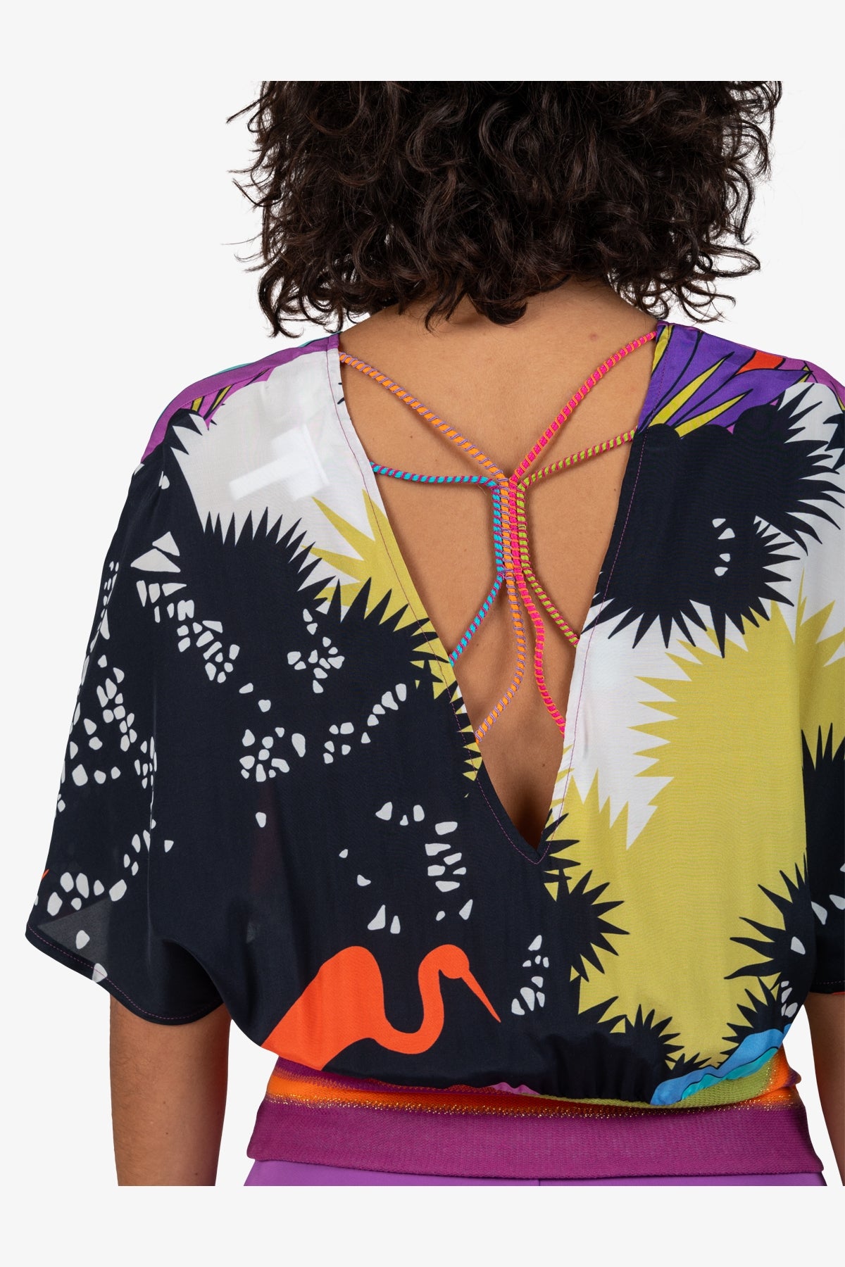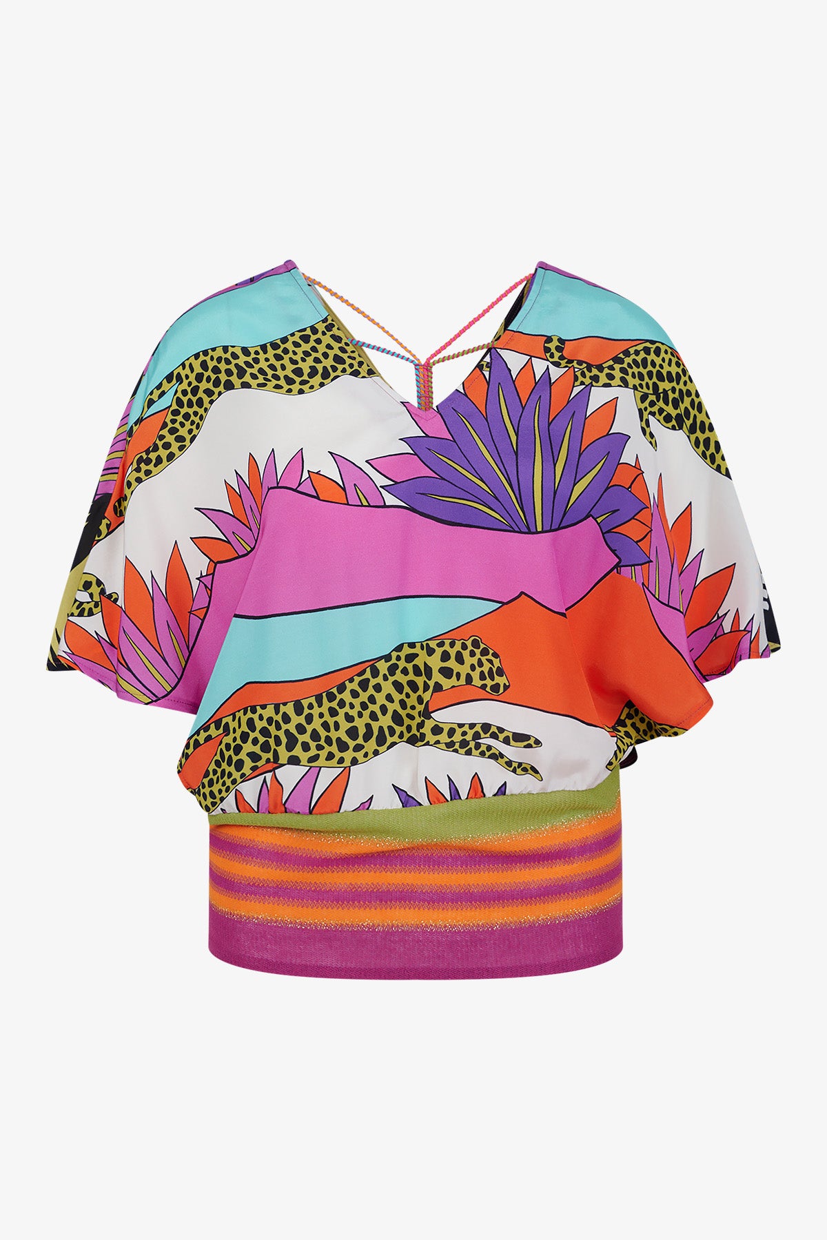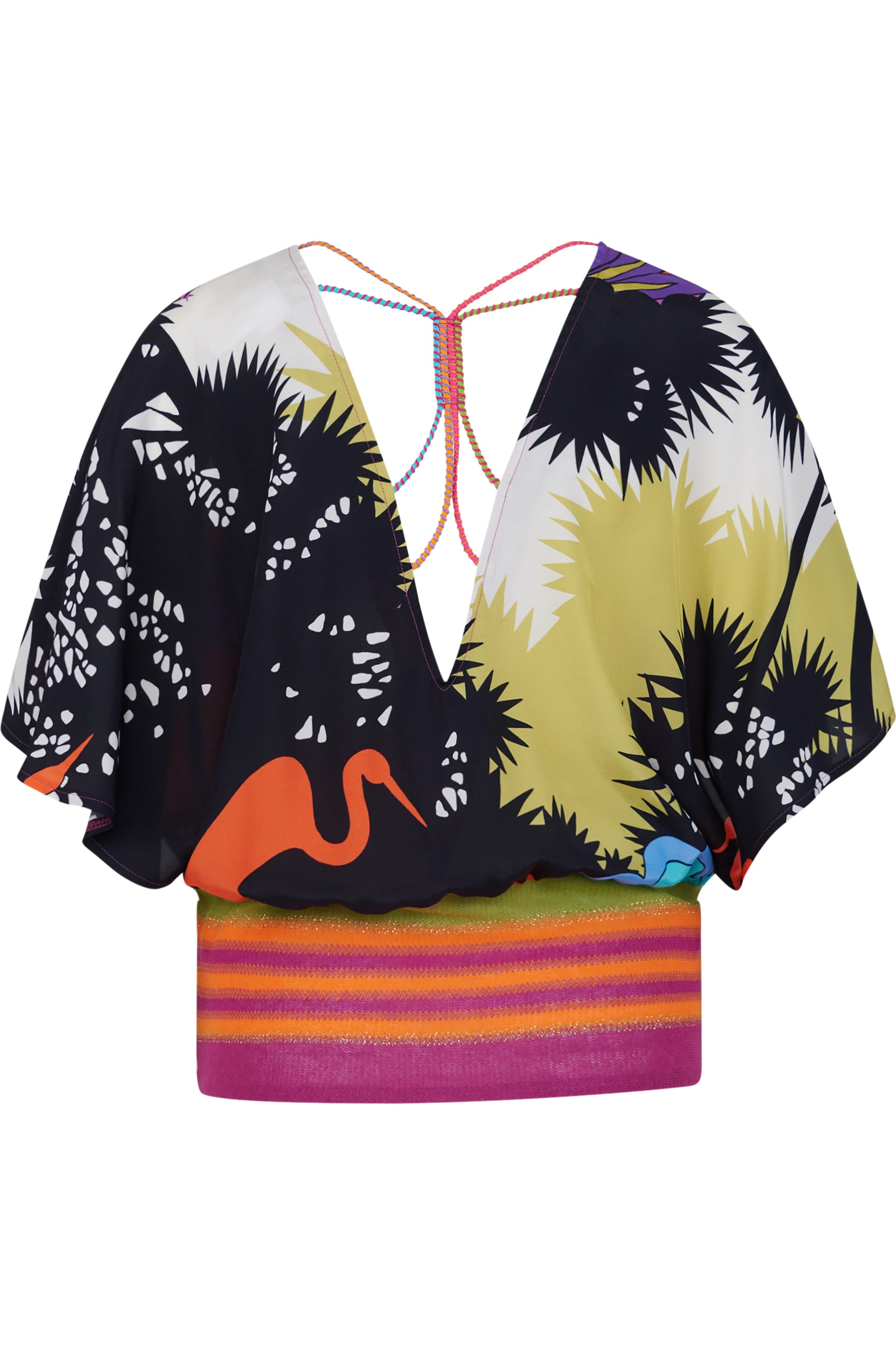 圖案:帶有系列印花的粘膠纖維和條紋針織面料亮點:背面有繩子細節36 碼後長:16.0 厘米
