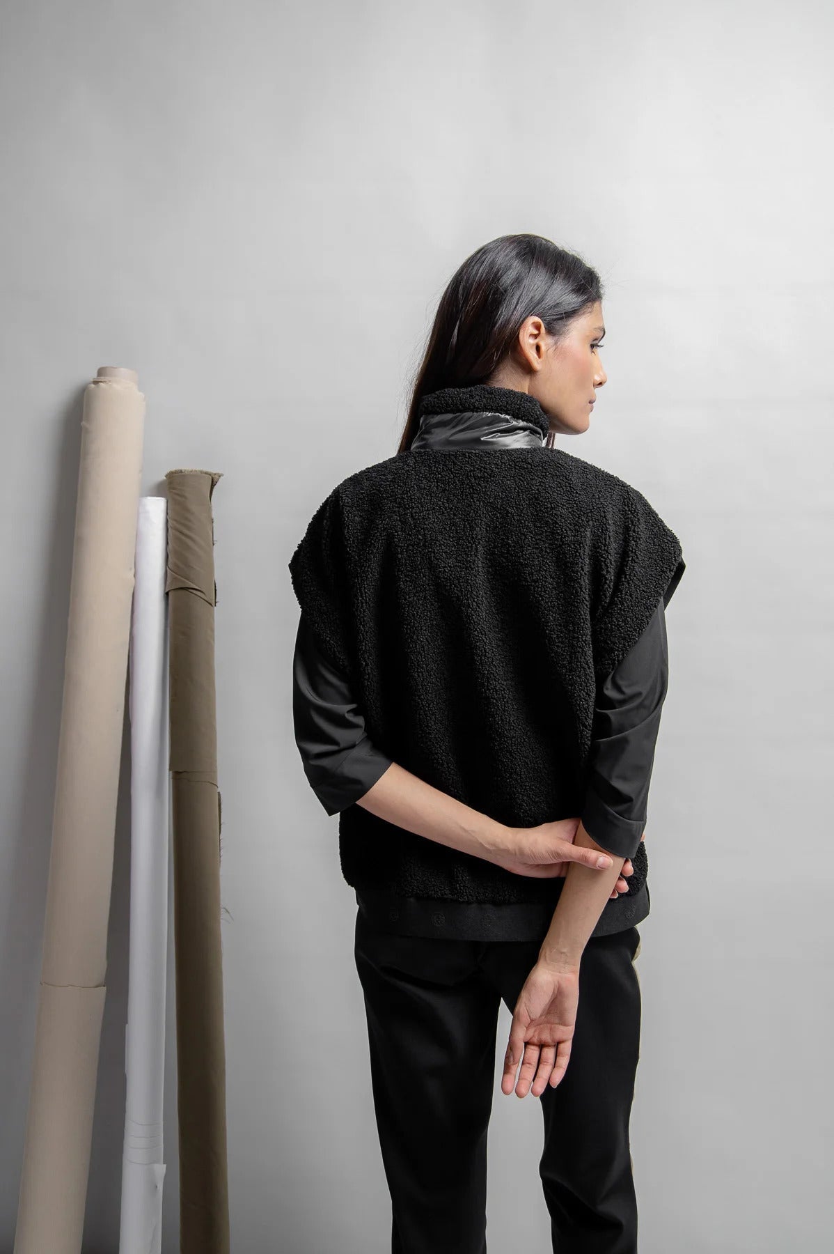 前中心可見縫製的雙向拉鍊作為閉合裝置,背心內部則是完全襯裡。