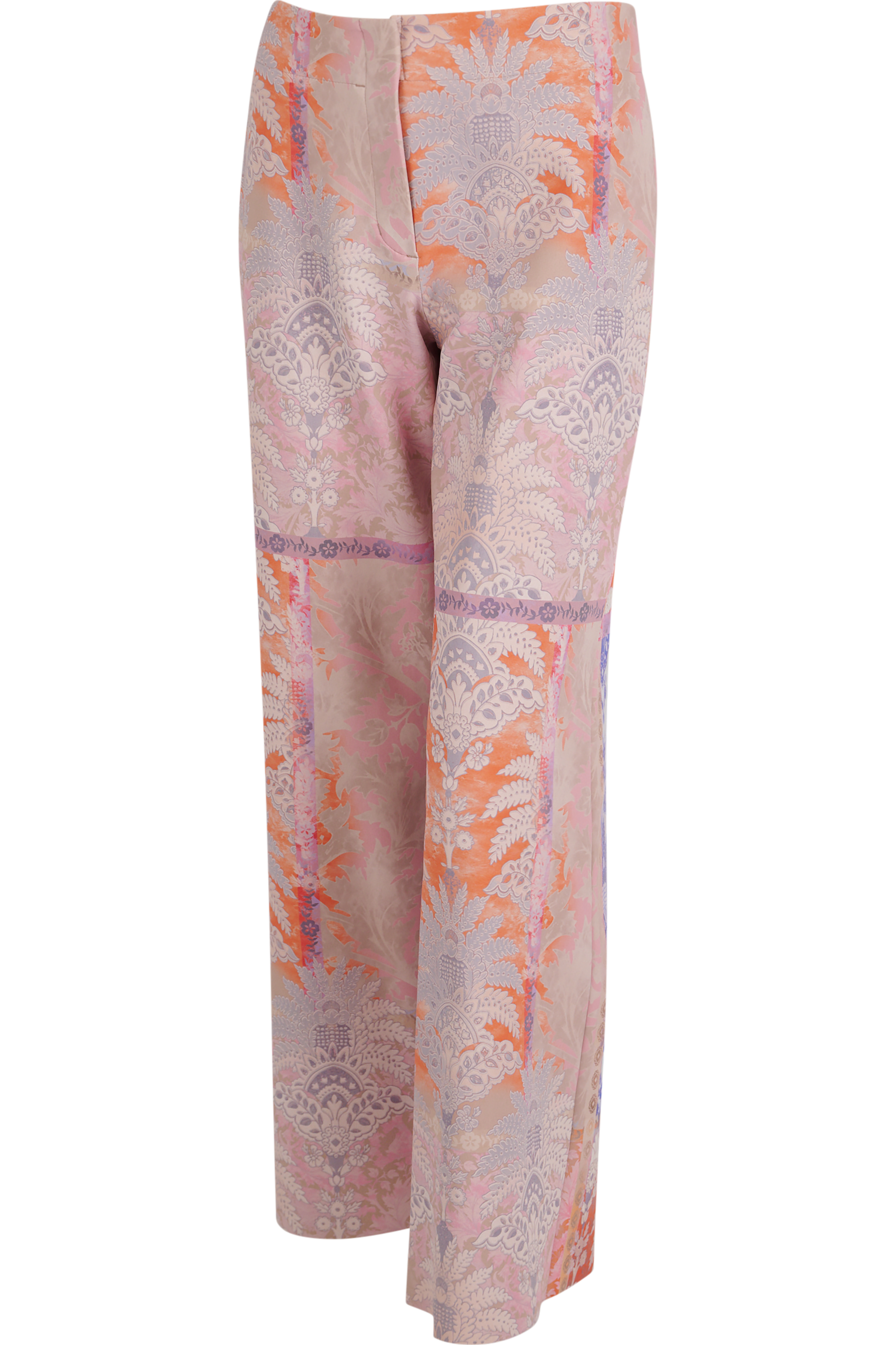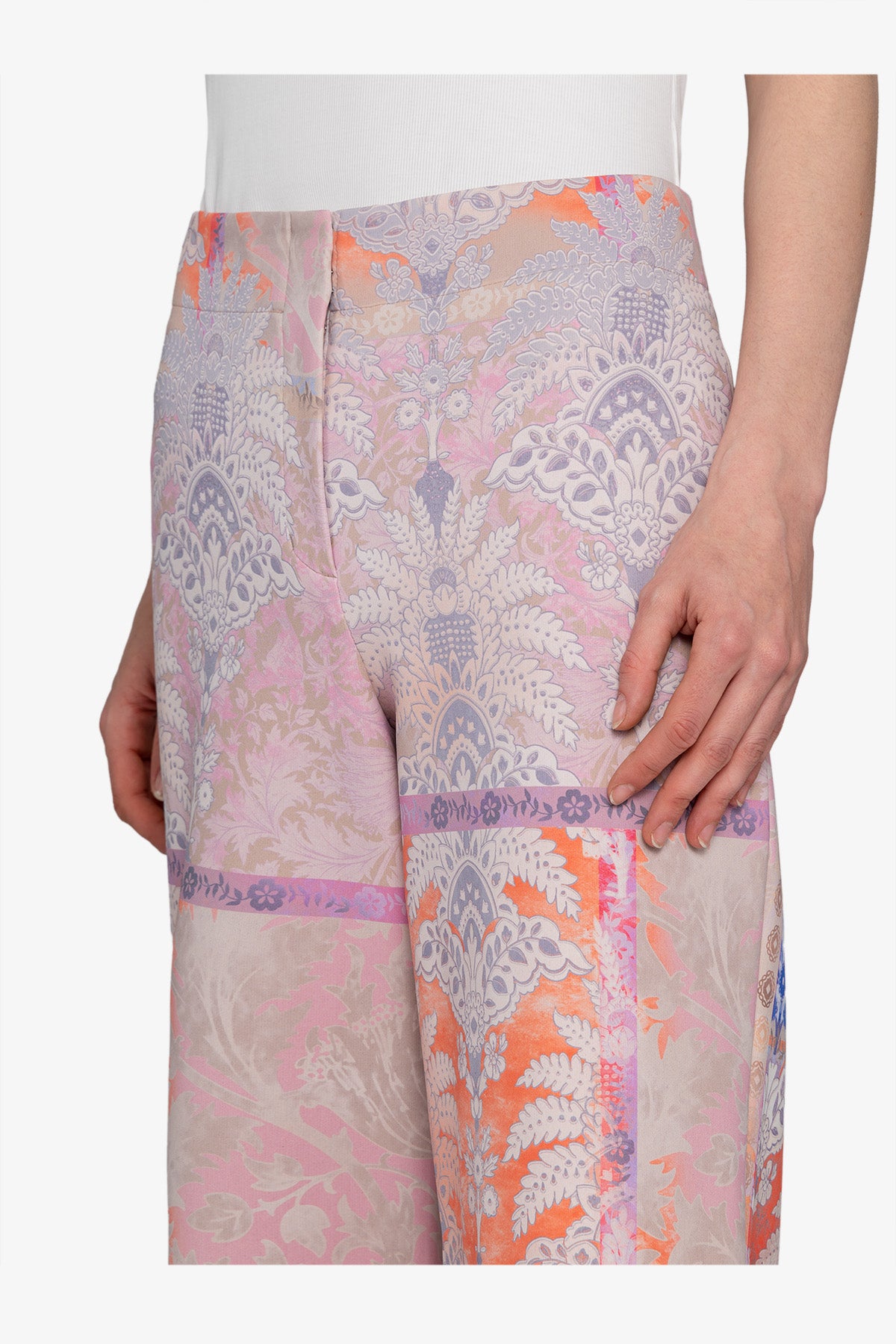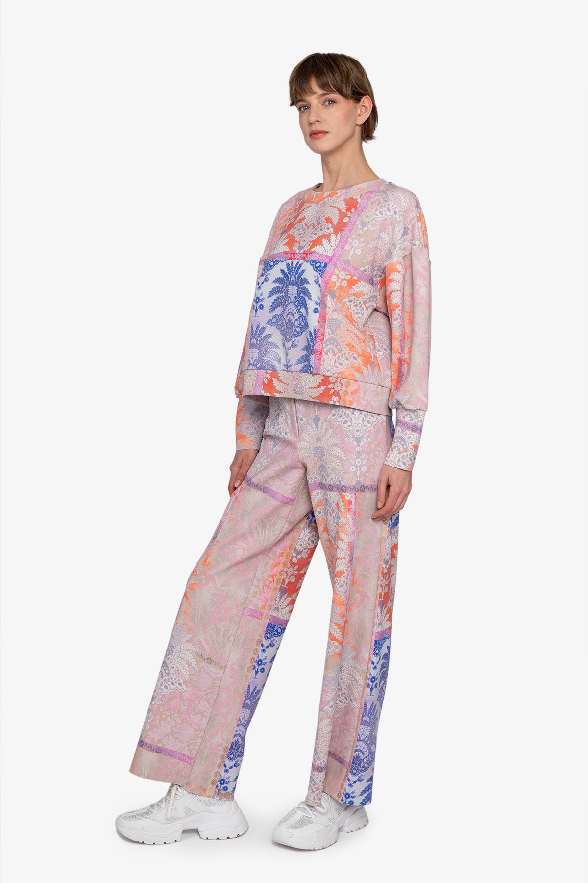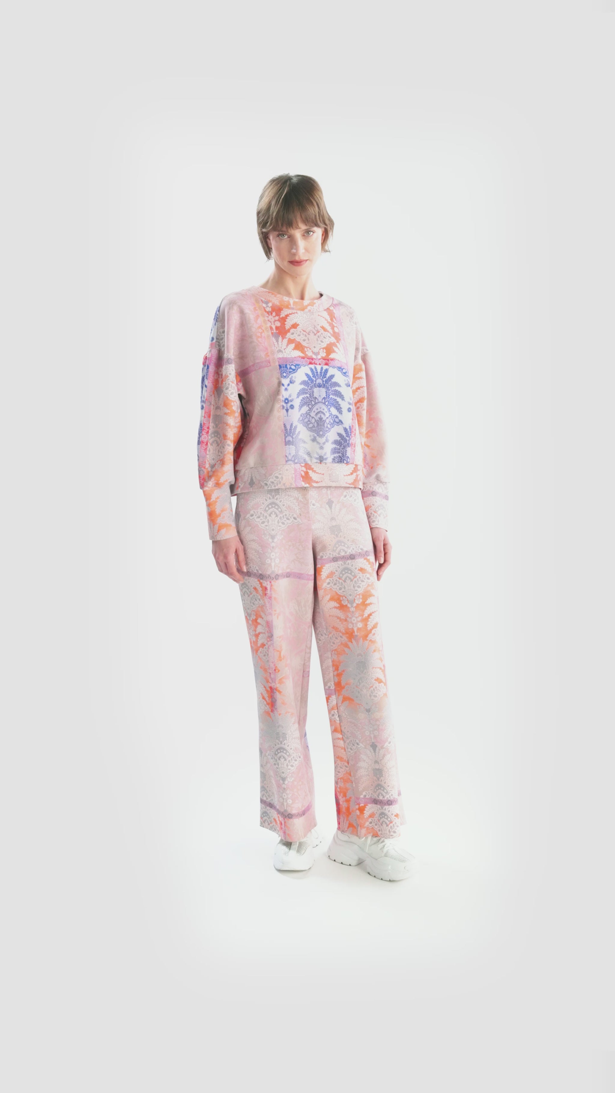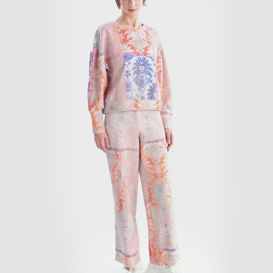 這款時尚運動長褲採用彩色全身印花和休閒褲管,採用時尚喇叭款式。